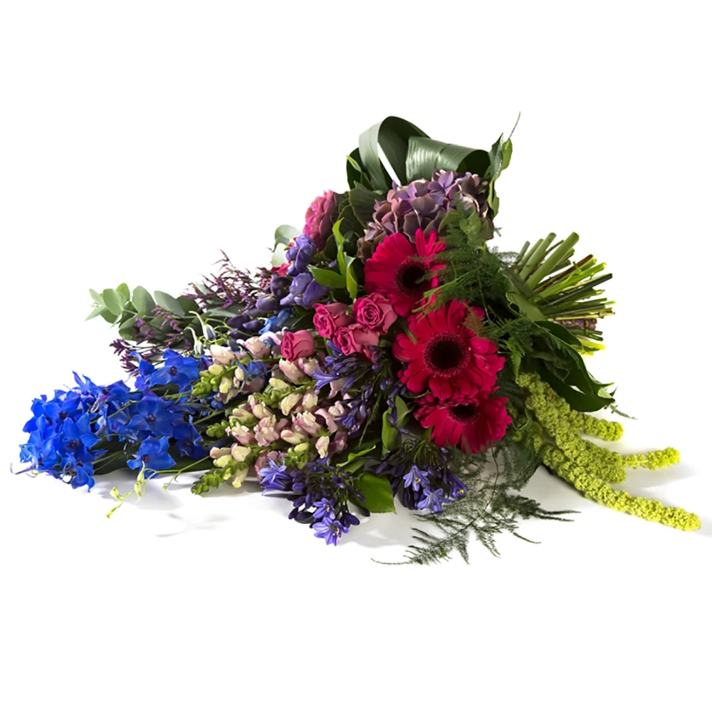 Reclining Funeral bouquet with flowers such as larkspur, hydrangea, agapanthus, gerbera, roses, limonium, snapdragon, loosestrife and green material. Depending on the availability of flowers, the composition may vary slightly.